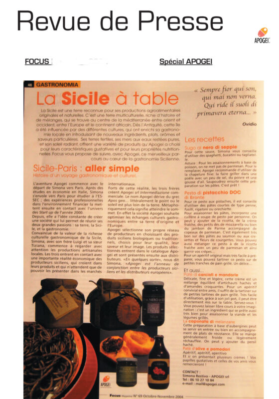 Ils m’ont trasmis cette passion de la cuisine italienne et des produits de ma terre natale. L’envie de les faire connaître en France et de dénicher de nouvelles perles rares, m’a motivée à créer ma société d’importation Apogei en 2003, et depuis 2019, la marque Les Deux Sicile