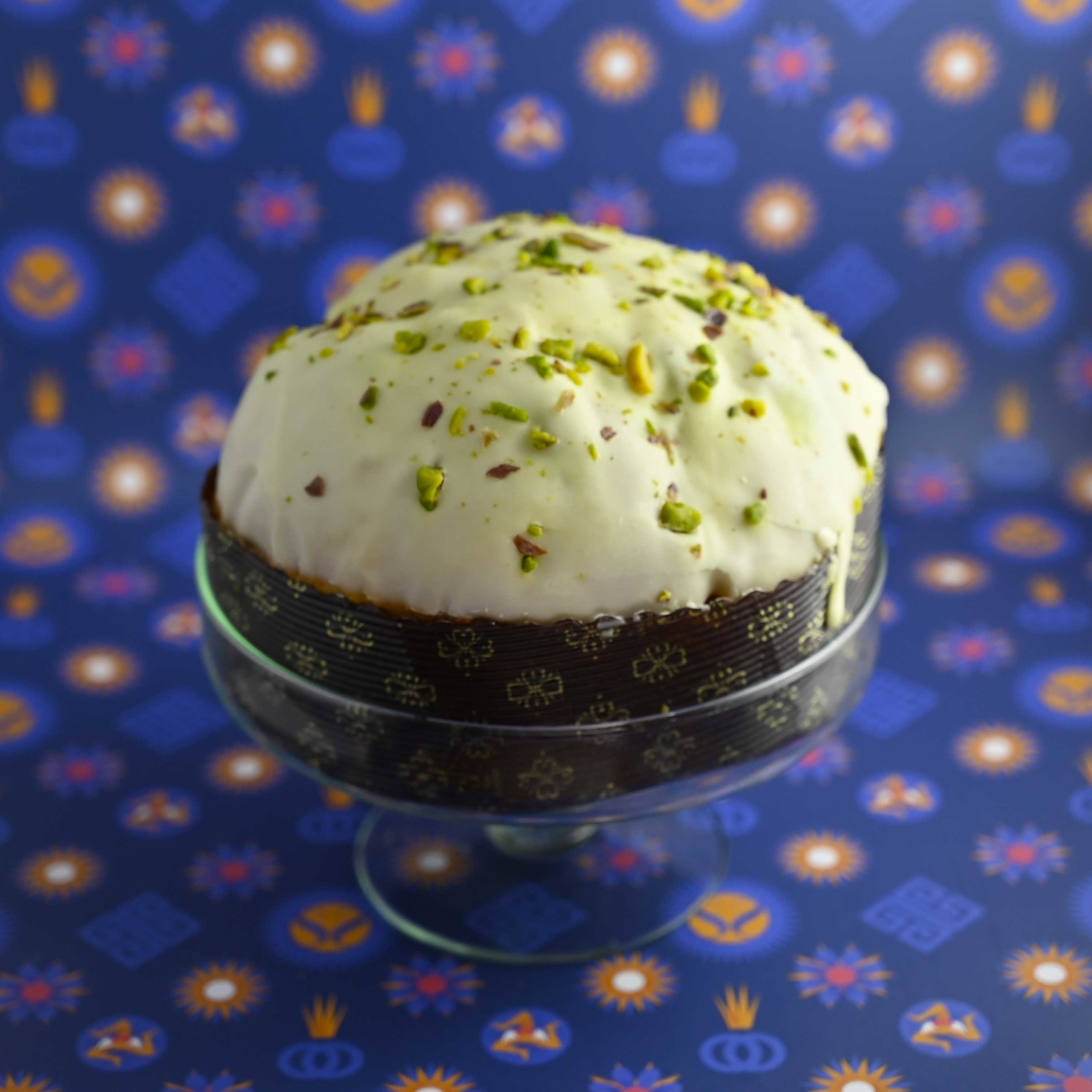 Panettone à la crème pistache : Panettone fourré à la crème de pistache et recouvert de chocolat blanc